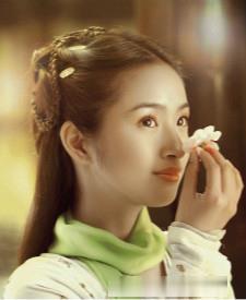 湖边:只见船尾一个女子持浆荡舟,长发披肩,全身白衣,头发上束了条金带,白雪一映,更是灿然生光。郭靖见这少女一身装束犹如仙女一般,不禁看的呆了。那船慢慢荡近,只见这女子方当韶龄,不过十五六岁年纪,肌肤胜雪、娇美无匹;容色绝丽,不可逼视 。